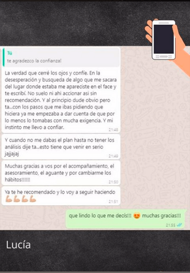 Este programa de nutrición y acompañamiento personalizado hace que esta experiencia sea única. Aprendí a conocerme en profundidad, saber la diferencia entre tener o sentir hambre, ansiedad, hambre emocional, el porqué de esas conductas. Porque actúo de esa forma, en que momentos, los sentimientos y poder expresarlos y estar acompañada en todo este proceso. Hoy descubrí que puedo controlar mis impulsos, y la compulsión por la comida. Descubrí que no es una dieta sino un estilo de vida saludable para quedarse.